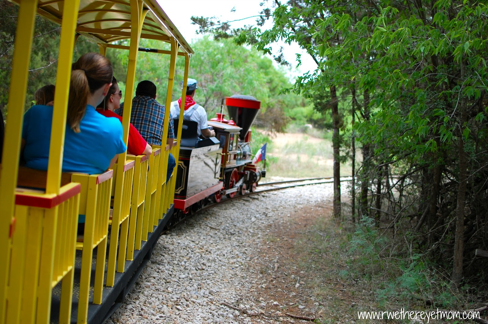 “Sophie” is a quarter-scale, fully electric locomotive that can go up to 8.5 miles per hour. She was brought to Central Texas by Texas Bells & Whistles, who operates her every weekend. The story of how she made it the park is a labor of love – the track was built by hand by her owners!!