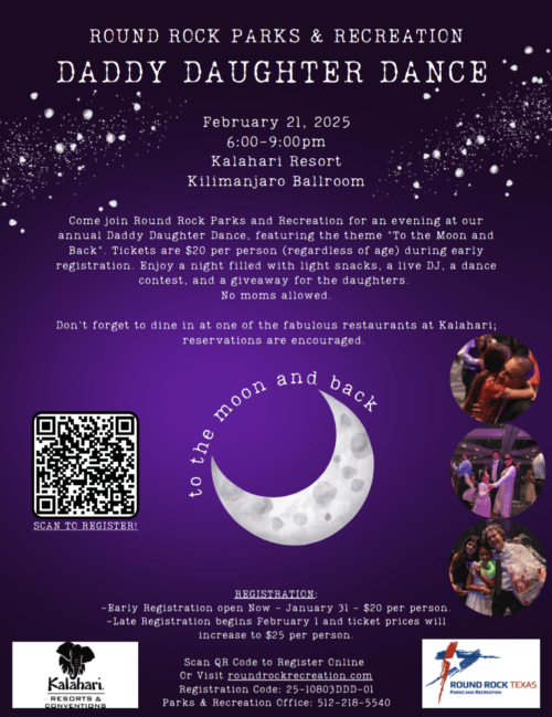 Join Round Rock Parks and Recreation for a spectacular evening at our annual Daddy Daughter Dance, featuring the theme “To the Moon and Back”. Meet us at the Kalahari Kilimanjaro Ballroom for takeoff on Friday, February 21st from 6pm to 9pm.