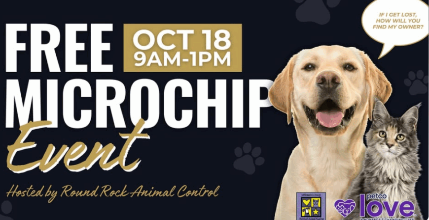 Oct 18 9:00 am - 1:00 pm Pet Microchip & Vaccine Event Round Rock Public Safety Training Center, 2801 N Mays St, Round Rock Event Details Get Directions