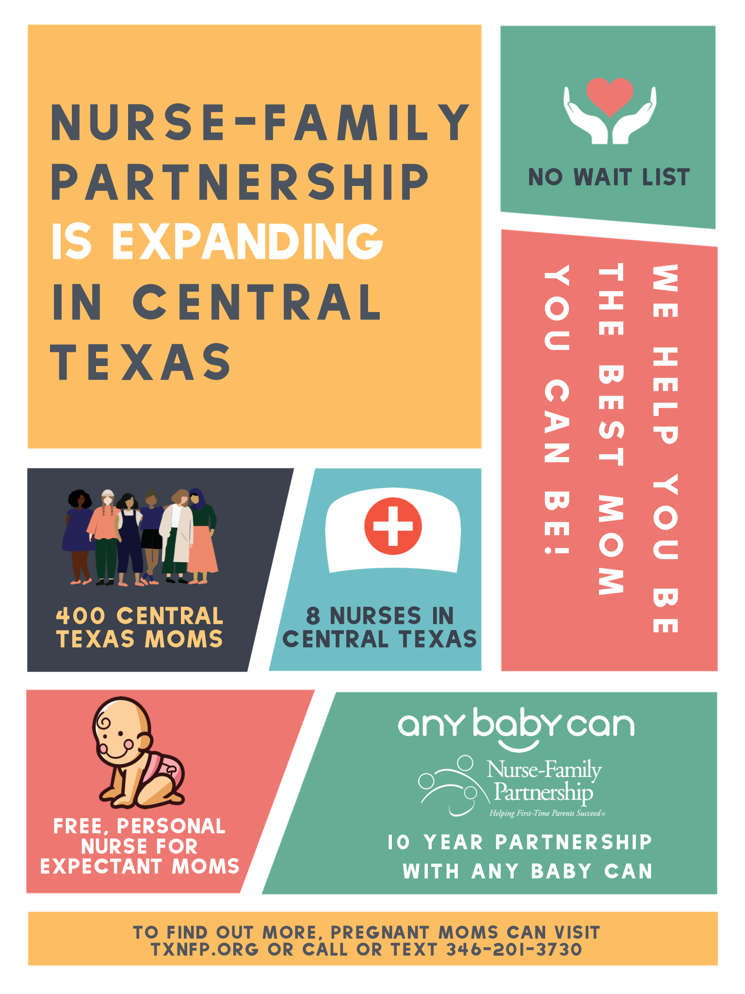 In Central Texas, Nurse-Family Partnership is celebrating a 10-year partnership with Any Baby Can, and is expanding the program to serve more expecting mothers. By the beginning of 2019 three more nurses will join the staff, bringing the team up to 16 nurses. This will be the largest NFP team in Texas. Any Baby Can expects to serve up to 400 expecting and new moms in the coming year.