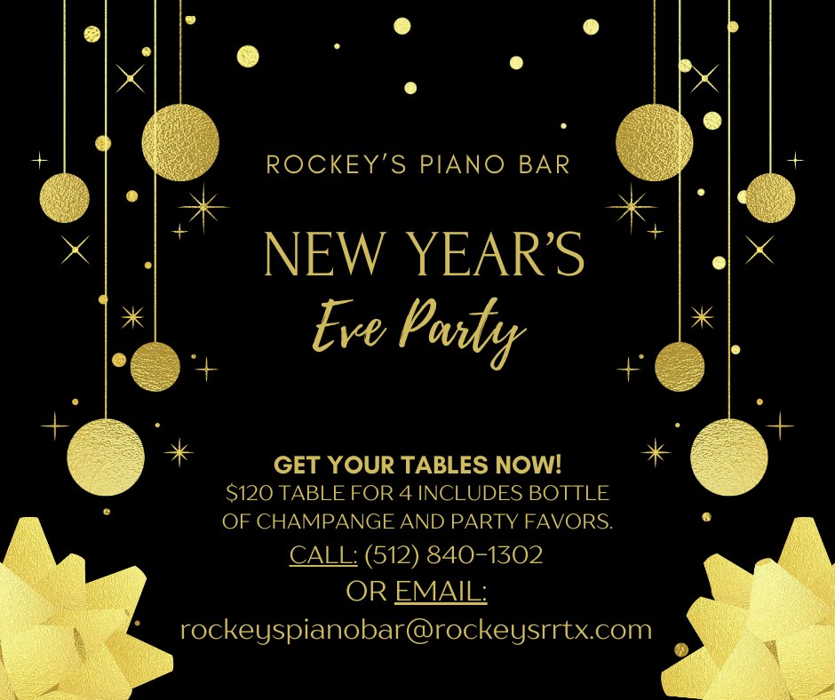 NYE Piano Show – Wednesday, December 31st! Celebrate NYE with us. A table of 4 is $120, and that includes your cover charge, bottle of champagne, and NYE party favors. Cover charge is $10 at the door, no reservations required. Call us at 512-840-1302 or email us at rockeyspianobar@rockeysrrtx.com to make your reservation.