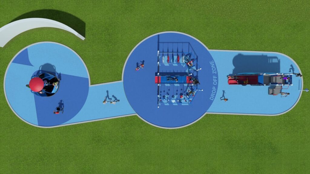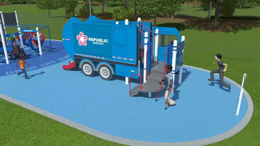 The project will include educational play features such as a recycling truck slide that feeds into sorting lanes, each designed to teach children about recycling, renewable energy, and sustainability, and a wheelchair accessible merry-go-round themed with educational graphics.